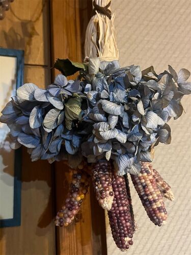 おととし収穫したグラスジェムコーンで、壁飾りを作った。アジサイは、去年かおととしにドライフラワーにしたもの。satomies.hatenadiary.com去年は植える場所の整地が適当で、うまく育たなかった。 今年はよく育っている。中身がきれいに出来上がらなくても…