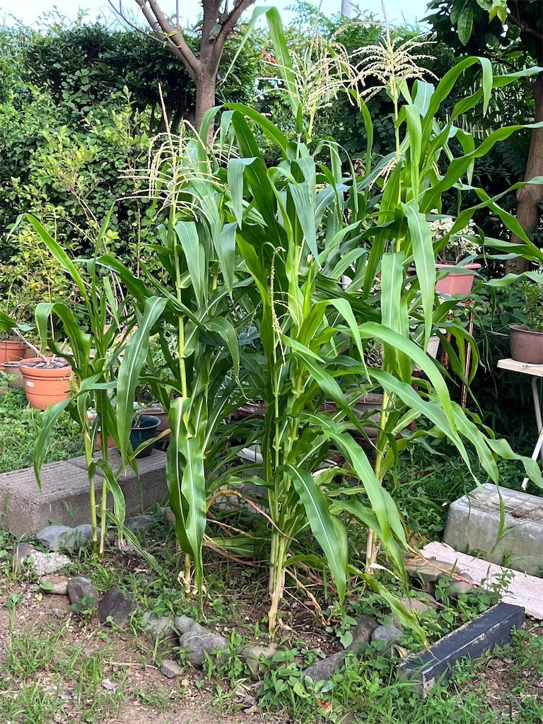 昨日、夫が「これはもうそろそろじゃない?」と実ひとつを指した。グラスジェムコーンは、実のまわりが枯れてこないと収穫できない。とりまく葉が薄茶色でカサカサになっていたので、「いける、いける」と答える。