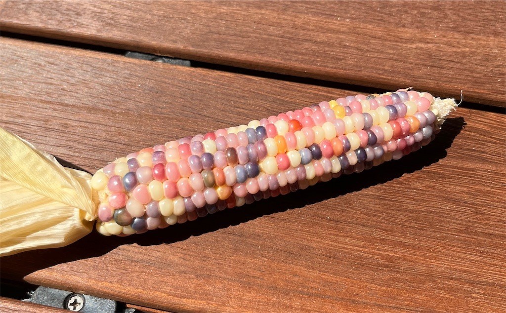 さて、「食べてもおいしくない」このトウモロコシを植えて育てるのは。とにかく、皮をむいてみなきゃ中の色がわからないことを楽しむため。縁日のクジ、感覚。