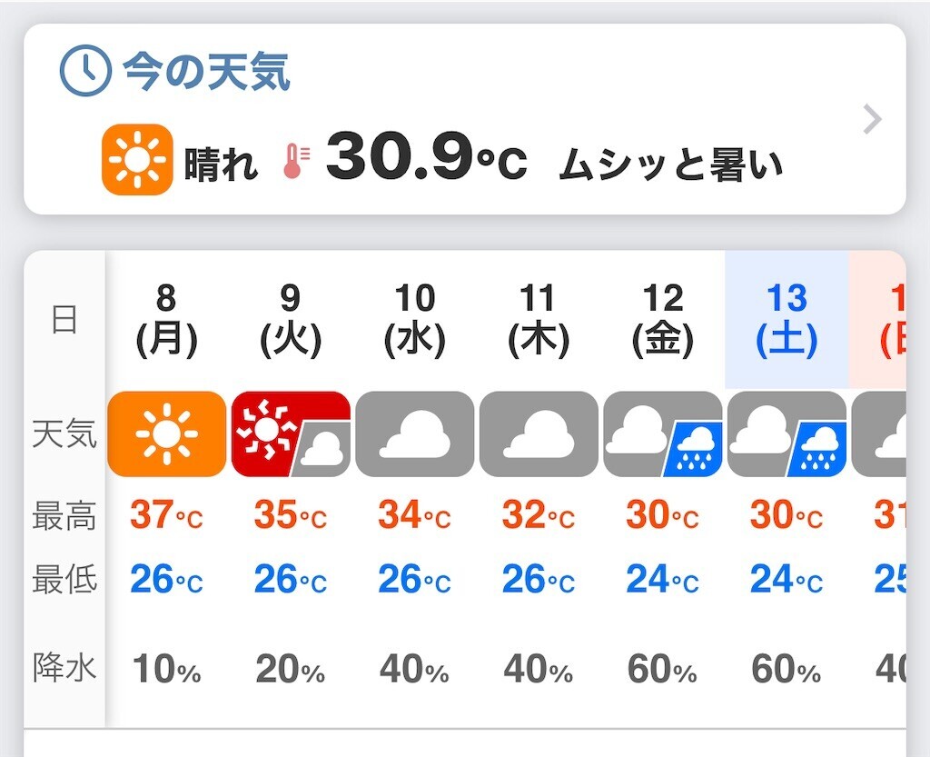 エアコンの効いた室内はよい、車もよい。キッチンやら洗濯機周りやら、エアコンをつけていない部屋に入る時やら最悪。夏がきつい。今日は最高気温が37度だったそうだ。夜の10時過ぎに、外はまだ30度を超えているんだそうだ。